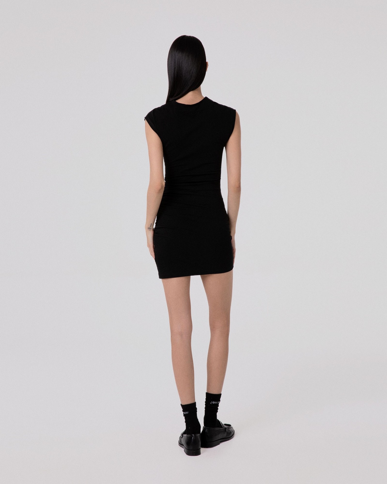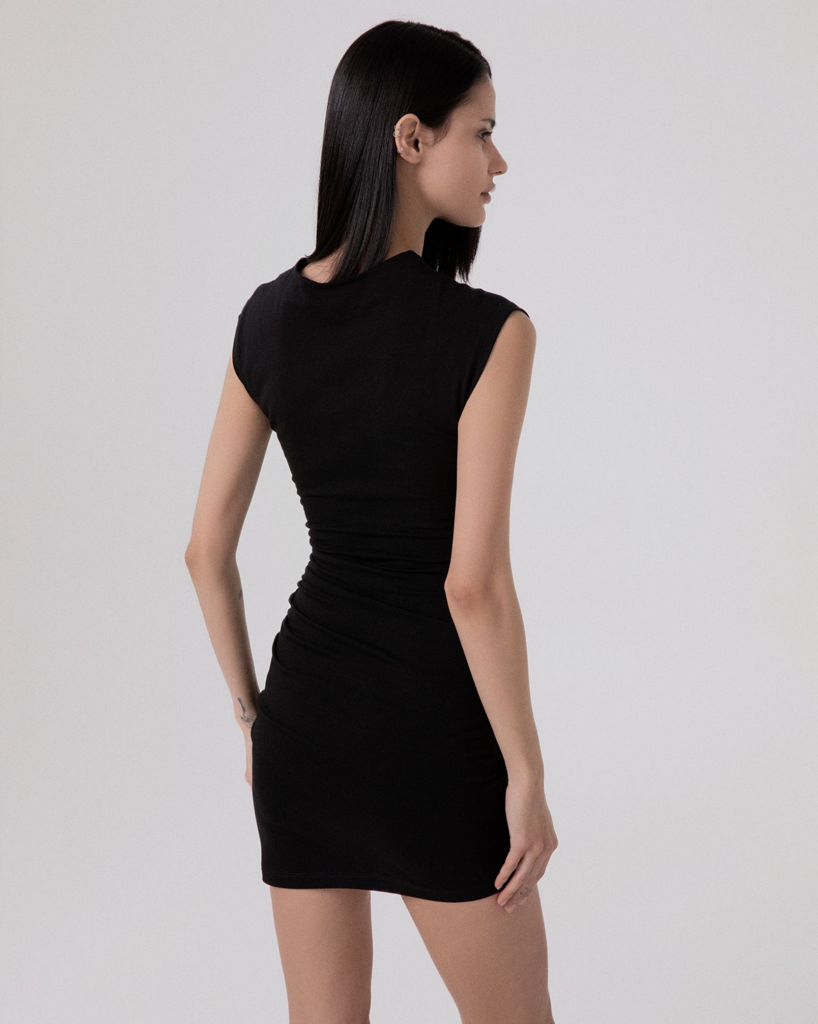 Short dress in two-way stretch with gathers