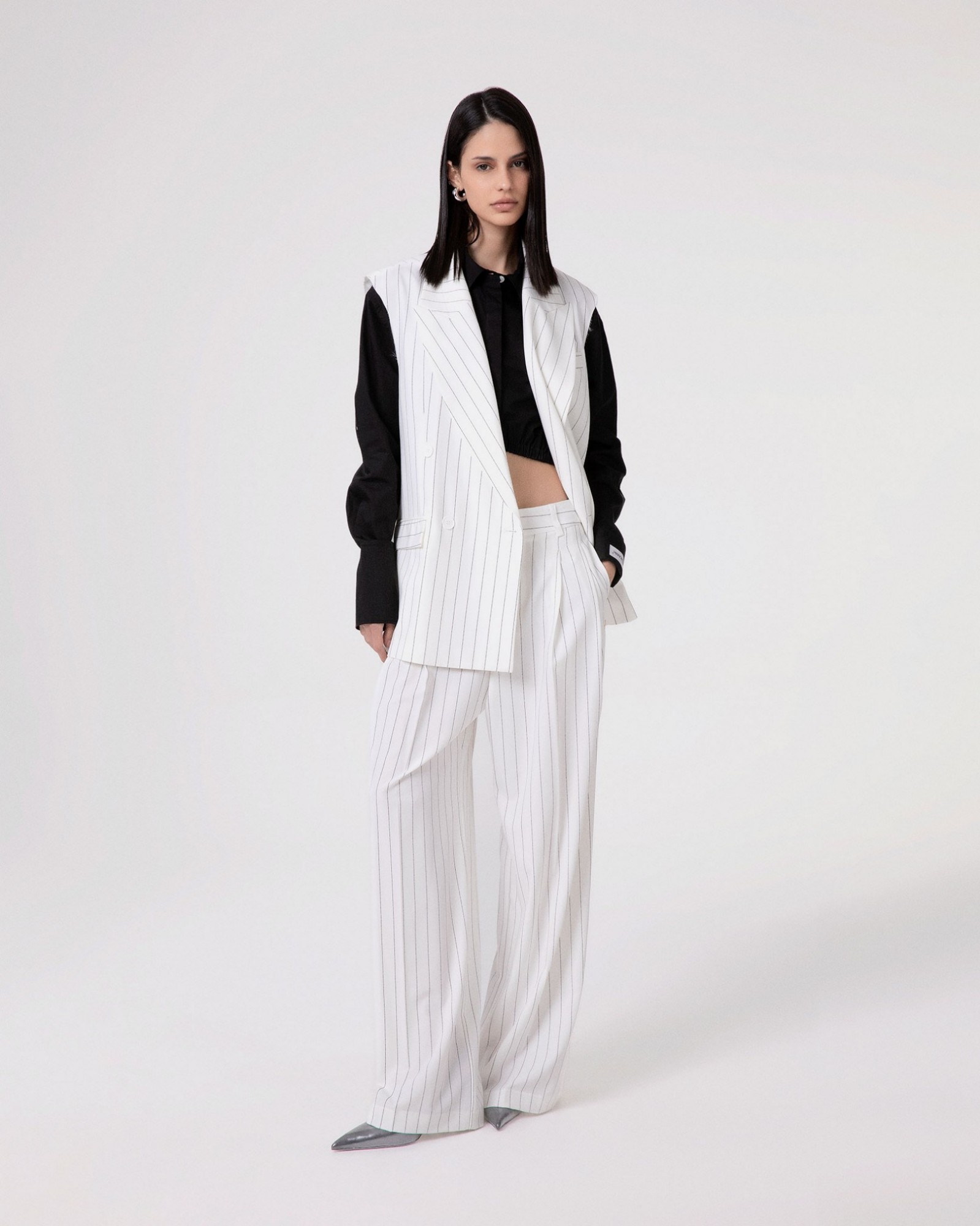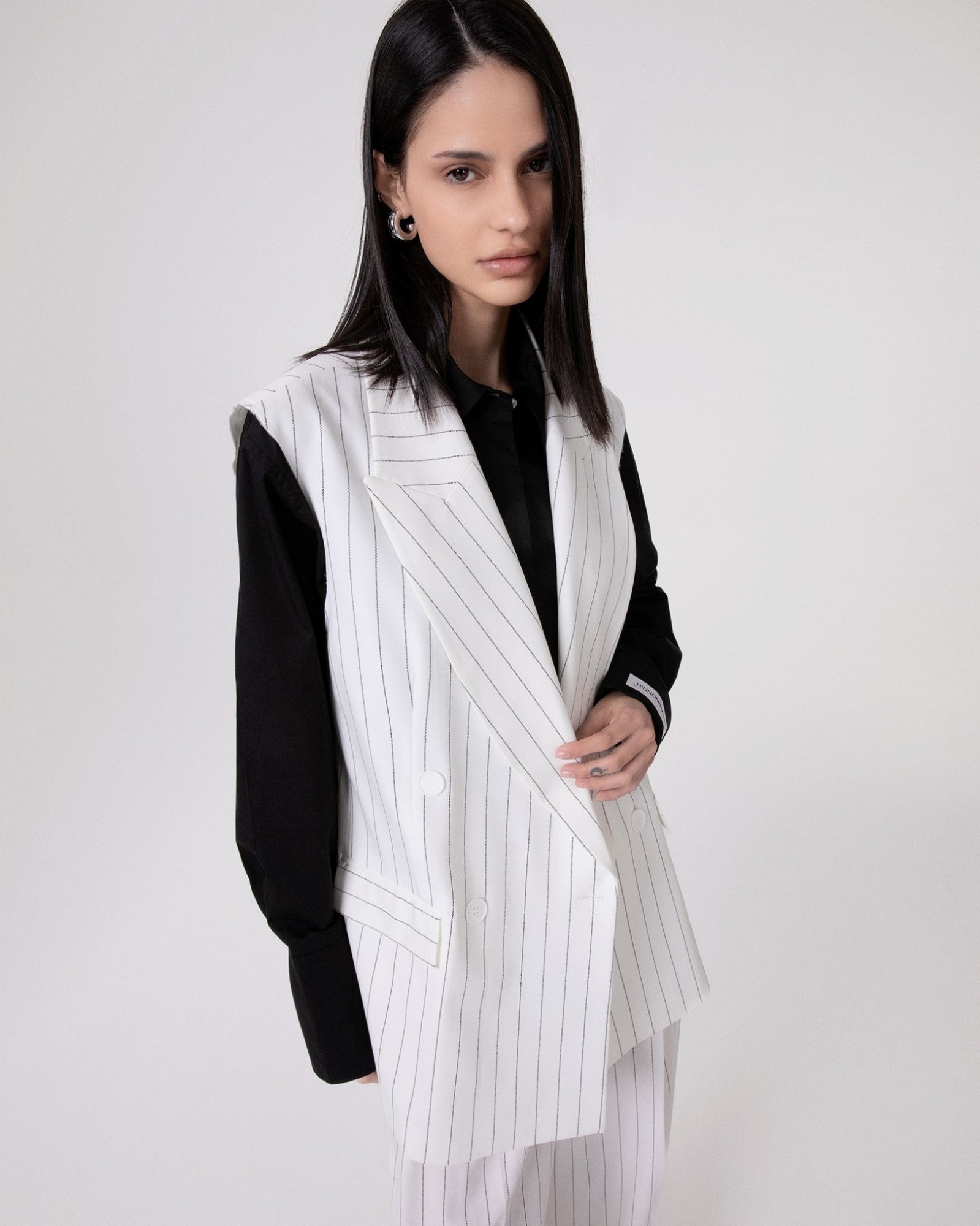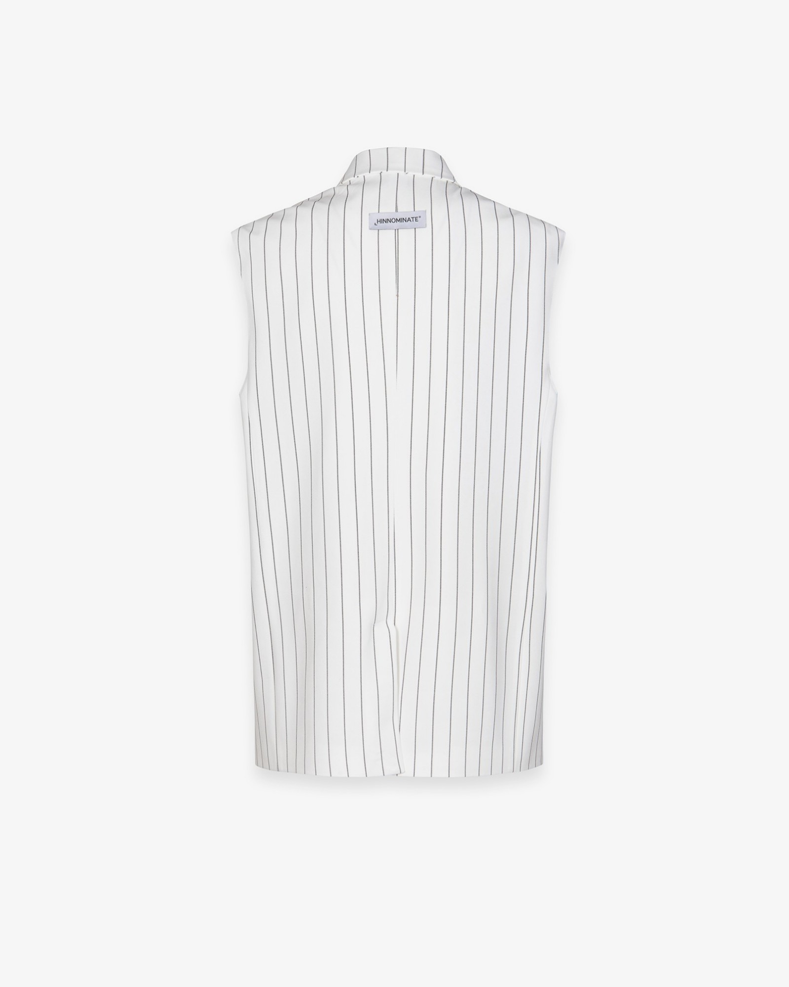 Double-breasted sleeveless pinstriped jacket